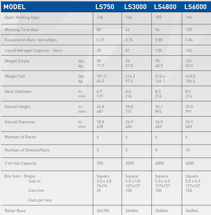 - LS Series is suitable for liquid or vapor phase storage. In vapor phase storage, temperature at the top of the racks is -190°C.