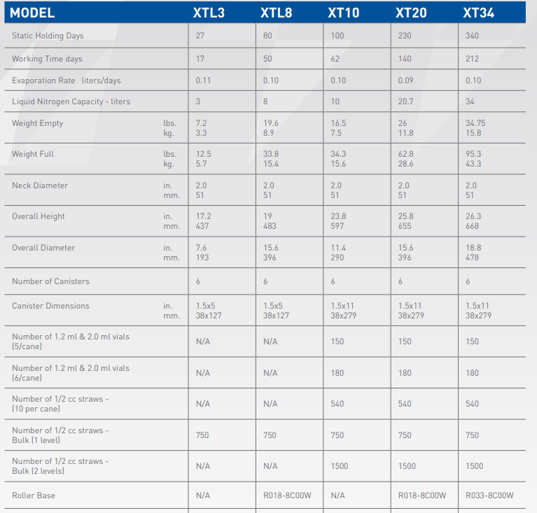 The Extended Time (XT) Series of cryogenic refrigerators are designed for long-term storage of a variety of materials at cryogenic temperatures. This series also offers low profile models (XTL), with 5” (127 mm) canisters.